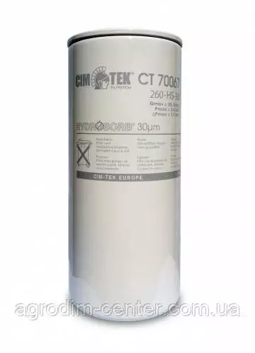 Фільтр CIMTEK CT70067 призначений для тонкого очищення палива в напірних паливороздавальних колонках відомчого, приватного або комерційного використання. Модель характеризується особливим наповнювачем, представленим просоченою смолою целюлозою, що забезпечує ефективну фільтрацію бензину і дизельного палива. Фільтр виконує очищення палива від механічних домішок і дрібного бруду, що забезпечує надійність роботи і справність агрегатів паливороздавальної колонки. Також модель CIMTEK CT70067 здійснює водовідділення, що значно підвищує якість палива. Принцип роботи фільтра заснований на кристаликах целюлози, які з'єднання єднуються з водою, перетворюючись на желе. У результаті відбувається відділення води від палива. Фільтр в змозі утримати до 260 мл води, і призначений для потоку палива не більше 65 л/хв. Розміри фільтру - 225х95 мм, а вага - 0,724 кг.