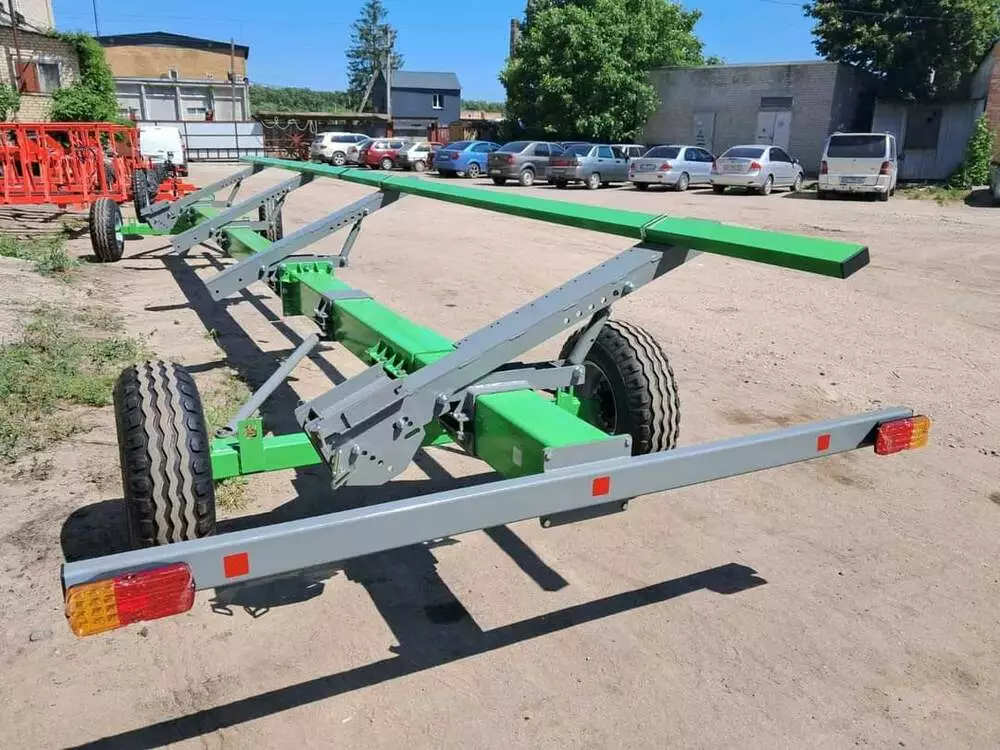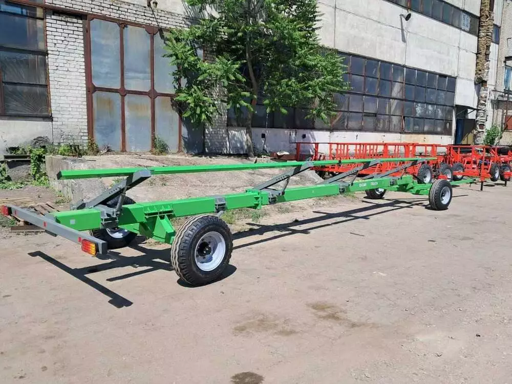 Візок для перевезення жниварок виготовлено за новим стандартом.Раму виготовлено з труби 200мм*200мм стінка 8 мм витримає без проблем жниварку до 3500 т. Задня вісь регульована,може рухатись для налаштування,а також є додаткова опція використання передньої частини 6-7м для транспортування кукурудзяних жниварок.